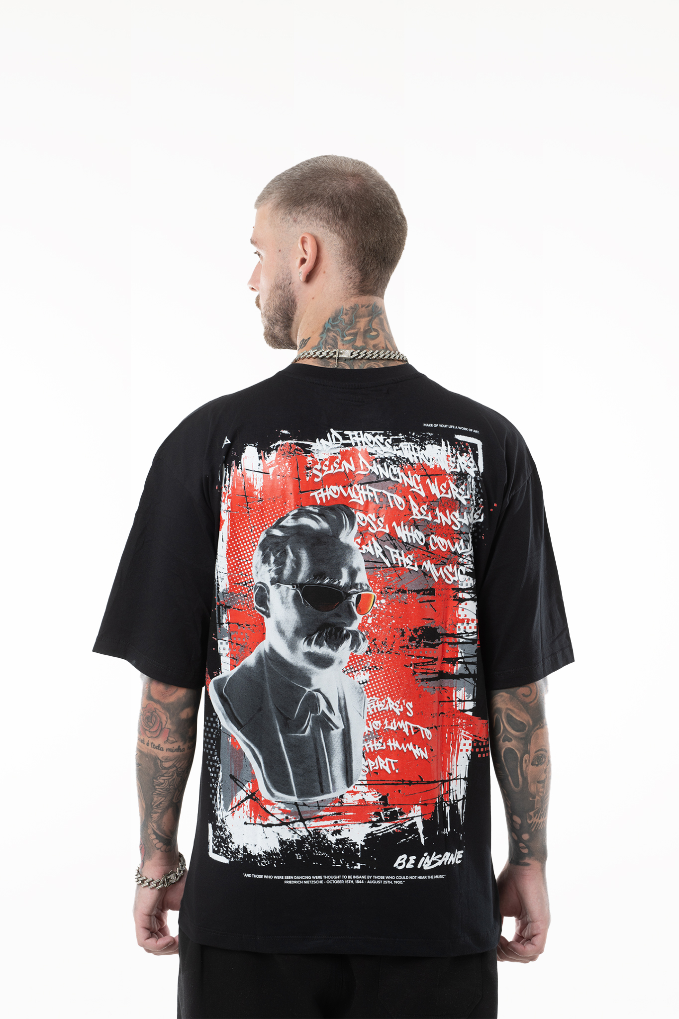 Uma camiseta inspirada na música INSANE do música eletrônica Becker. Uma peça rica em detalhes para quem quer um produto diferenciado para compor o look, onde cada detalhe traz um conceito único, com frases que não apenas se alinham à identidade da marca, mas também ressoam de maneira significativa com aqueles que escolhem incorporar essa peça ao seu estilo. Baseada na obra de Friedrich Nietzsche, a frase na parte de trás "E aqueles que foram vistos dançando foram considerados loucos por aqueles que não conseguiam ouvir a música", transparece todo o conceito que a peça carrega. Não há graça em ser uma pessoa comum. O que faz você se destacar de todos? Seja diferente, seja mais, seja único, enlouqueça!